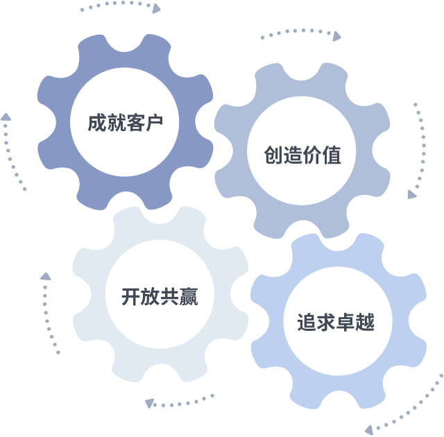 成就客户是一切决策的出发点,创造价值是衡量所有工作的标准,追求卓越是网投平台网址做事做人的态度,开放共赢是网投平台网址的格局也是最终的结果。价值观的齿轮环环相扣,推动着组织里的每个人不断向前。